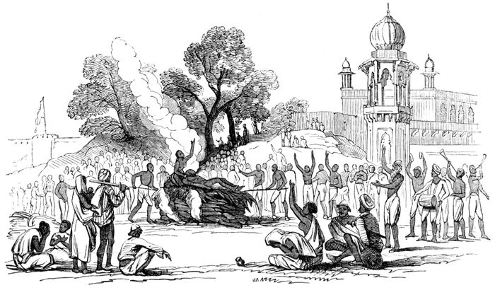 We now cross to the opposite side, the left bank of the Hoogly, to a murda ghāt, a spot where the funeral rites of the Hindūs are performed. The nearest relative, as is the custom, is stirring up the body, and pushing it into the flames with a long pole; much oil and ghī (clarified butter) is poured over the wood, to make it burn fiercely: in all probability the son 20of the deceased is performing the ceremony. We read of the Romans burning their dead, regard it in a classical light, and think of it without disgust; but when we see the ceremony really performed, it is very painful: nevertheless, a sort of absurdity is mixed with it in the mind, as “Stir him up with the long pole” flashes across the memory. On the conclusion of the ceremony, the relatives bathe and return to their homes. The charpāī, or native bed, on which the corpse is carried down to the river side, being reckoned unclean, is generally thrown into the stream, or left on the bank. If a large quantity of wood and ghī be consumed, we may imagine the deceased to have been a rich man; the relatives of the very poor scarcely do more than scorch the body, and throw it into the river, where it floats swollen and scorched—a horrible sight. The burning of the body is one of the first ceremonies the Hindūs perform for the help of the dead in a future state. If this ceremony have not been attended to, the rites for the repose of the soul cannot be performed.