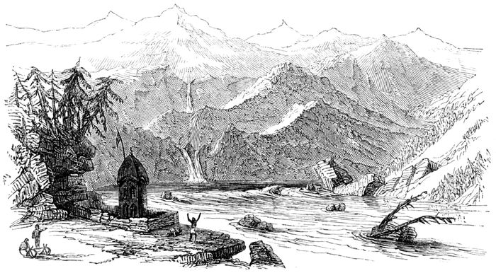The subject of the Diorama which we shall have the honour to explain, is the course of the Ganges from its source to Fort William, Bengal:—its picturesque scenery, the towns and temples on its banks, the religious ceremonies, and the customs of the inhabitants, both Hindū and Musalmān, will be pourtrayed. This noble river, considered the most sacred in Hindostān, takes its rise at Gangoutrī, in the Himalaya, and issues from the mountains upon the plains near Hurdwar. It passes within a few miles of Meerut, flowing on to Furrackabad, Cawnpore, and Allahabad; at the latter, it joins the Jumna, the first river of importance with which it unites. Hence its course becomes more winding, its bed wider, and the united streams flow past Mirzapūr, Chunar, Benares, and Ghazipūr. A little above Chupra, the River Ghogra falls into the Ganges on the left bank; and below Arrah, on the opposite bank, is its junction with the Soane. At Hājīpūr, the Gunduk increases the powerful stream, which flows on and passes Patna, Monghir, Bhagulpūr, Colgong, and Rajmahal, until it reaches Gopalgunj, at which place a branch of the Ganges quits the main stream, and flowing by Sooty and Moorshedabad is called the Bhāgīrathī, until it reaches Nuddea. The main stream of the Ganges running to the eastward, joins the Berhampootra, and after its union with that river, falls into the Bay of Bengal. This, the main stream of the Ganges, is not looked upon with equal veneration by the Hindūs as the branch before-mentioned, which, flowing by Sooty and Moorshedabad, is called the Bhāgīrathī, until it reaches Nuddea, at which place it is joined by the Jellinghy, and the united currents flow on, passing Calcutta, to the island of Sāgar, under the name of the Hoogly. Prior to the commencement of the nineteenth century, the Ganges had been traced by Hindū pilgrims from Hindostān into the snowy mountains that run in a direction north-west to south-east on the frontiers of India. We will now ascend the stream, stopping, as is the custom with pilgrims, at the junction of rivers, and other sacred places, considered peculiarly holy by the Hindūs, until we reach the last shrine, Gangoutrī, the source of the Holy River.