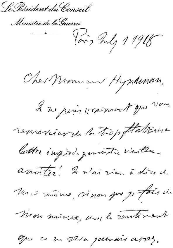 From first to last Clemenceau has been a stalwart Republican and a thoroughgoing democratic politician of the advanced Left, with strong tendencies to Socialism. These tendencies I begged him more than once to turn into actual realities and to join, or at least to act in complete harmony with, the Socialists. This seemed possible towards the close of the Dreyfus affair. But I must admit here that, much as I regret that Socialism has never enjoyed the full advantage of his services, Clemenceau, as an avowed member of the Socialist Party, could not have played the glorious part for France as a whole which he has played since the beginning of the war. It was far more important, at such a desperate crisis, to carry with him the overwhelming majority of his countrymen, including even the reactionaries, than to act with a minority that has shown itself at variance with the real sentiments of the Republic, when France was fighting for her existence.