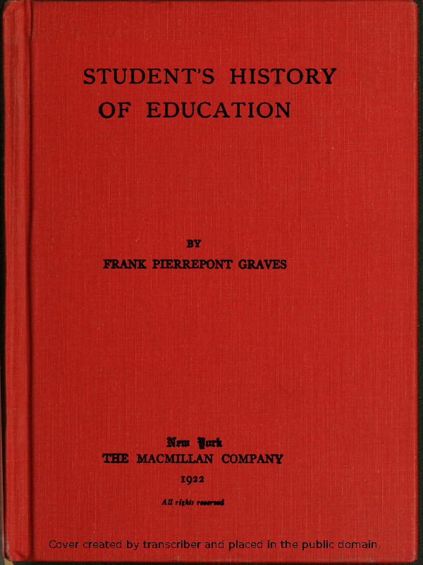 My indebtedness for many valuable features in this book is heavy. The idea of an Outline, which appears at the beginning of each chapter, was first suggested to me by the History of Modern Elementary Education of Dean S. C. Parker of the College of Education, University of Chicago, although I have adopted a different explanation of its value. Professor Parker also read through the manuscript and sent me a general estimate of it. Professors J. H. Coursault of the University of Missouri, A. J. Jones of the University of Maine, W. H. Kilpatrick of Columbia University, A. R. Mead of Ohio Wesleyan University, and A. L. Suhrie of the West Chester (Pennsylvania) State Normal School, have all read the manuscript through with exceeding care and furnished me with numerous corrections and criticisms, both particular and x general. Professor T. H. Briggs of Columbia University suggested a number of improvements in the chapter upon Present Day Tendencies in Education (XXVII). The chapter upon the Educational Influences of the Reformation (XIII) has been relieved of several inaccuracies, and possibly of some Protestant bias, through the assistance of the Rev. Benedict Guldner, S. J., of St. Joseph’s College, and of Brother Denis Edward, F. S. C., President of La Salle College, Philadelphia. I have also, as usual, been greatly aided by my wife, Helen Wadsworth Graves.