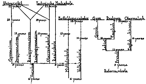 Industrial Schools in Europe.—In Germany, where this training is most effective, the work has for fifty years been rapidly developing through the Fortbildungsschulen (see Fig. 55). The course in these schools at first consisted largely of review work, but the rapid spread of elementary schools soon enabled them to devote all the time to technical education. Training is now afforded not only for the rank and file of workmen in the different trades, but for higher grades of workers, such as foremen and superintendents. Girls are likewise trained in a wide variety of vocations. During the last twenty-five years there have also been developed continuation schools to furnish theoretical courses in physical sciences, mathematics, bookkeeping, drawing, history, and law. In North Germany there is a tendency to confine the courses to theoretical training, and leave the practical side to the care of the employers, but the South German states generally combine theoretical and practical work, and develop schools adapted to the industries of the various Work of Kerschensteiner. localities. Through the work of Kerschensteiner, Munich has even included an extra class in the elementary schools, to bridge the gap between school life and employment.
