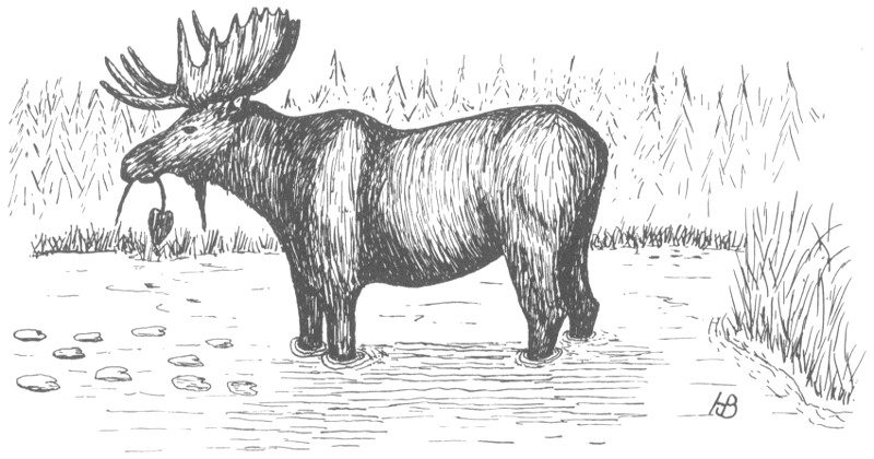 Marshy meadows and the margins of lakes or streams are the favorite summer haunts of the moose. His usual summer diet consists of the various aquatic plants and his long legs are of great assistance in wading for the plants as well as helping him get through the deep snows of winter. The moose is better fitted to withstand the rigors of winter than the deer and elk and is accustomed to remaining in higher country during the winter. During such times his food is made up of the foliage, twigs and bark of trees and shrubs. Moose are powerful swimmers and dive for aquatic plants if the water is too deep for wading.