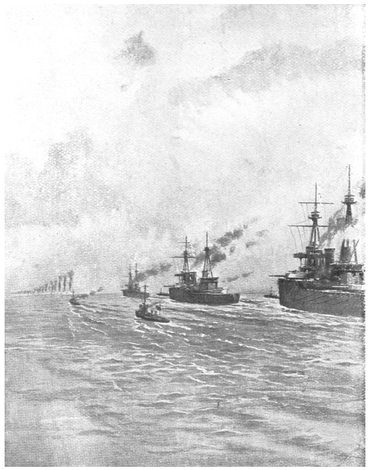 The British vessels at once began a chase in extended order, and the hearts of our men must have been deeply stirred by the admiral’s simple signal, “God save the King!” One of the signallers afterwards wrote: “It was taken up and flung far and wide through space by each of the fleet in turn, until it seemed as though it would never cease. I consider it a privilege to have been one of the few to bear the signal.” A little after noon Admiral Sturdee came within suitable range of the five enemy ships, and decided to attack with the Invincible, the Inflexible, and the Glasgow. How the officers and crew of the last-named vessel had longed for this happy moment!