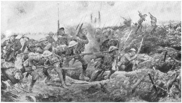 They went on at a hot pace with their bayonets lowered. Out of the crumpled earth—all pits and holes and hillocks, torn up by great gun-fire—grey figures rose and fled. They were German soldiers terror-stricken by this rushing tide of men.
