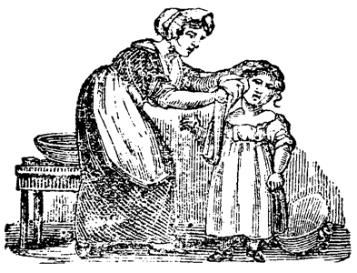 Eliza takes care of her own clothes and always folds them up neatly, and shows her little sister to do so too; and, therefore, she knows where they are and can find them in the dark as well as in the light. When she and Harriet come home from school, she takes the school books out of the basket, and puts them in their proper place, and never leaves them scattered about, to be in the way of her mamma.