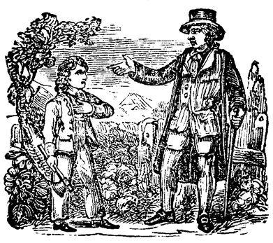 Little George with his Hatchet in his hand, and his Papa pointing to the ruined Cherry-tree.