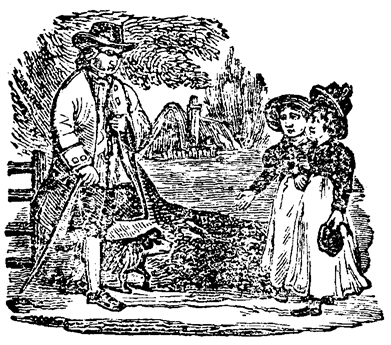 One fine morning they were neatly dressed by their mamma, and walked out as usual. A short distance from the house, they met an old gentleman who was very kind, wealthy, and friendly, and very fond of good children. His residence was in a very splendid mansion,[Pg 8] in a village about two miles from the cottage of Mr. Davis. He wore a plain coat and an old-fashioned hat. Owing to his advanced age, he made use of spectacles—all which gave him a very grave appearance. The girls, who were then about ten years of age, had been taught by their good and excellent mamma, that aged people who conduct themselves properly, should always be treated with kindness, respect, and attention. They, therefore, as they came near the old gentleman, made a polite and modest courtesy to him.