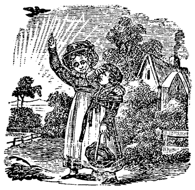 One fine morning they arose very early, and took a walk to inhale the pure air of the hills and mountains, just as the sun came forth to look upon the beauties of creation, while the lark soared high above them on its happy wings. Eliza was delighted with the sight; and, putting her left hand gently on Harriet's shoulder, pointed to the[Pg 12] Lark with her right hand. Harriet took off her bonnet, and put up her right hand to screen her eyes from the dazzling rays of the sun, while she looked at the beautiful bird. After they had walked a little farther, they returned home very cheerful and much refreshed.