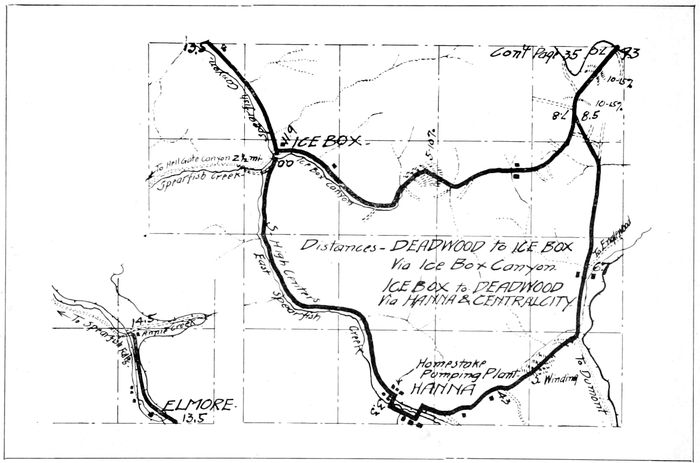 The Homestake Pumping Plant at Hanna, 6 miles from Lead, and the Hydro-electric plant at Spearfish, 15 miles from Lead, furnish the water and power used in the Homestake properties. The Hydro-electric Plant is the largest of its kind in the Hills. The water is carried in a tunnel 5 miles long from the river in Spearfish Canyon, at a point 8 miles from Spearfish, to the reservoir on top of the ridge overlooking and directly south of the city. The three surge towers, on the pipe lines leading from the reservoir down the 700 foot drop to the power plant, may be seen for many miles.