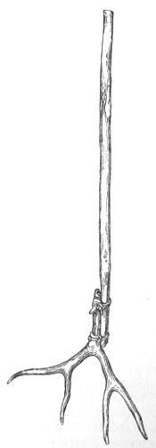 [21] “The first that rakes are mentioned in the stories of my tribe so far as I know, is in the tale of ‘The Grandson.’ There is a little lake down near Short River where lived an old magic woman, whom we call Old-woman-who-never-dies. There is a level piece of ground near by, about five miles long by one and a half mile wide. This flat land was the garden of Old-woman-who-never-dies. Her servants were the deer that thronged the near-by timber. These deer worked her garden for her. All buck deer have horns; and with their horns the deer raked up the weeds and refuse of Old-woman-who-never-dies’s garden.