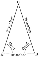 I do not intend to trouble you much with Euclid in these lectures, but as many of my young friends have learned the sixth book, I will just refer to the well-known23 proposition, which tells us that the lengths of the corresponding sides of two similar triangles are proportional. We have here two similar triangles. There is the big one with the boy at one corner, the girl at the other, and the ball overhead. Here is the small triangle which we have just drawn. These triangles are similar because they have got the same angles, and it was to insure that they should have the same angles that we were so careful in shaping the cards. As these two triangles are similar, their sides must be proportional. We have agreed that the line A B, which is twelve inches long, is to represent the length of the table between the little boy and girl. Hence the distance, A C, must, on the same scale, be the interval between the ball and the boy at the end. This is twenty inches on the drawing, and therefore the actual distance from the end of the table to the ball is twenty feet.