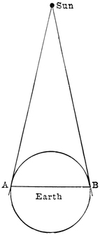 Of course, astronomers must choose two stations which are far more widely separated than are those in24 our little experiment. In fact, the greater the interval between the two stations, the better. Astronomers require a much longer distance than from one side of this room to the other, or from one side of London to the other side. If it were merely a balloon at which we were looking, then, when one observer at one side of London and another at the opposite side shaped their cards carefully, we should be able to tell the height of the balloon very easily. But as the sun is so much further off than any balloon could ever be, we must separate the observers much more widely. Even the breadth of England would not be enough, so we have to make them separate more and more until they are as widely divided as it is possible for any two people on this earth to be. One astronomer takes up his position at A (Fig. 7), and the other at the opposite side at B, so that they can both see the sun. They are obliged to use a much more accurate way of measuring the angles than by cutting out cards with pairs of scissors; and as the astronomer at A is not able to see his friend at B, it becomes no easy matter to measure the angles accurately. However, we shall not now trouble ourselves about such difficulties. It may suffice for the present to know that the angles are measured by delicate and very accurate instruments used by astronomers.25 They will not, indeed, make a little sketch such as sufficed for our purpose. They make a calculation which is a much more accurate way of effecting true measurement. The astronomers know the size of the earth, and thus they know how many thousands of miles lie between the two stations where the observations are made. This distance means in their calculation just what the length of the table did in our sketch. From each end of the line they set off an angle just as we did, and the astronomer must use the principle of similar triangles which he finds in Euclid, just we had to do. At last, when they have calculated the sides of their triangle, they obtain the distance of the sun.