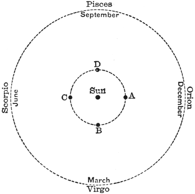 We may, however, specially remind the beginner that the objects on this map are not always to be seen, and as an illustration of the way in which the situation and the visibility of the constellations are affected by the time of year, I shall take the case of the Pleiades and follow them through a season. Let us suppose that we make a search for this group at 11 P.M. every night. On the 1st of January, the Pleiades will be found high up in the sky in the southwest. On the 1st of March, they will be setting in the west at the same hour. On the 1st of May, the Pleiades are not visible, neither are they on the 1st of July. On the 1st of September, they will be seen low down in the east. On the 1st of November, they will be high in the heavens in the southeast. On the ensuing 1st of January, the Pleiades will be found back in the same place which they occupied on the same date in the preceding year, and so on throughout the cycle. Of course, you will not suppose that their changes are due to actual motions in the group of stars themselves. They are merely apparent, and are to be explained by the motion of the earth round its axis, and the revolution around the sun.