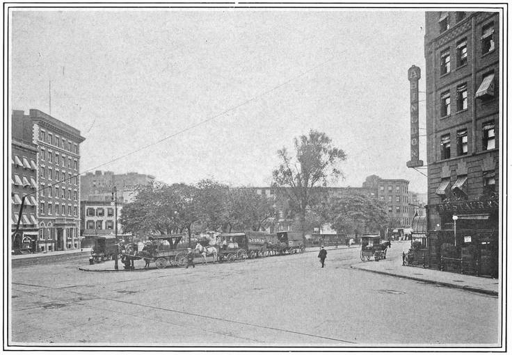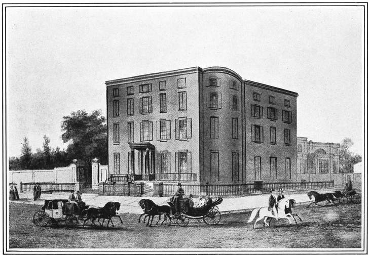 11 Among buildings that will be recalled to memory by the older citizens it would have been a satisfaction to have been able to show pictures of the Brick (Presbyterian) Church, that stood, with its yard, on Park Row, taking in the block bounded by Spruce, Nassau, and Beekman streets; or Burton’s Theater in Chambers Street; the Irving House, later Delmonico’s, on the corner of Broadway and the same street; of the old New York Hospital on Broadway near Thomas Street, standing far back with its beautiful lawn and grand old trees; of the St. Nicholas Hotel near Spring Street; of the old Coster mansion (later a Chinese museum), built of granite in the style of the Astor House, near Prince Street; and Tiffany’s place across the way, with the same Atlas upholding the clock over the door; of the Metropolitan Hotel on the next block with Niblo’s Garden; of Bleecker Street with Depau Row;3 of Bond Street with the large Ward (later Sampson) residence on the corner; the Russell residence on the corner of Great Jones Street; the famous old New York Hotel; the Lorillard mansion at Tenth Street; the large brownstone residence of Judge James Roosevelt, near Thirteenth Street, famous for the hospitality of its owners, and the red brick residence of Cornelius V. S. Roosevelt, grandfather of the President, on the corner12 of Union Square, having the entrance on Broadway.