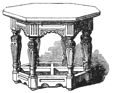 THYINE WOOD.—The wood of the Thuja Articulata, now named Callitris Quadrivalvis, a tree of the cypress sub-order of coniferæ, from 20 to 30 feet high. It is a native of Algiers and the Atlas range of North Africa. The wood is dark colored, hard, and fragrant, taking a fine polish; it yields an odoriferous resin called Sanderach, which was much used by the Romans for incense in the worship of their gods. Thyine takes its name from "to burn incense." It was much prized[264] by the ancient Greeks and Romans, not only because it was considered sacred but also on account of the beauty of the wood for various ornamental purposes. Pliny speaks of the mania of his countrymen for ornaments made of this wood, and tells us that when Roman ladies were upbraided by their husbands for their extravagance in pearls, they retorted upon them for their excessive fondness for tables made of thyine wood. So great a rage was there for ornamental cabinet work in ancient Rome that Cicero had a table made of it that cost £9,000. Ornaments made of this wood can be seen in the Museum at Kew, presented by the late Jerome Napoleon. The ceiling and floor of the celebrated Mosque of Cordova are of thyine wood, and it is also referred to in the Bible.