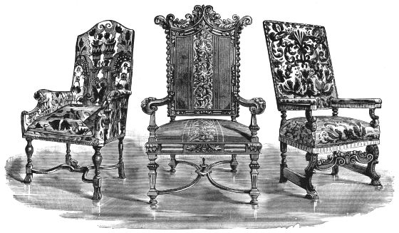 GOBELINS, BEAUVAIS, AND AUBUSSON TAPESTRY.—The famous factory of Gobelins originated in the establishment of some dye works in the Faubourg St. Marcel of Paris, by two brothers, Gilles and Jean Gobelin, who had introduced from Venice the art of dyeing scarlet; they also produced some other excellent colors, and this enterprise—at first considered foolish, and acquiring the name of Folie Gobelin—afterwards became most successful. This was in the reign of François I.; they subsequently added a tapestry factory to their dye works. Either in 1662 or in 1667, as different authorities state, Colbert, who had succeeded Cardinal Mazarin as Chief Adviser and Minister of Louis XIV., purchased the factory from the Gobelin family, and reorganised the establishment as the Royal Upholstery Works, employing the artists Lebrun, Berain, Simon Vouet, and others, to furnish subjects for the cartoons, the former artist being appointed Director of the Works. Since 1697 the manufacture of tapestry only has been carried on, and the product of these celebrated looms has become known as Gobelins tapestry. Previous to this time, however, namely, 1669, Colbert ordered the manufacture at Gobelins of what is termed the "low warp" tapestry suitable for furniture—a branch of manufacture which had been transferred to the State works of Beauvais, where the special mode of making tapestry, suitable for the covering of chairs and sofas, has since been carried on, the looms of Gobelins being more generally employed to produce larger panels for hangings. The fine texture, the brilliant colorings of the famous tapestry, are world famous; and enormous sums are commanded by some of the older panels, the tints of which are softened by age, while the condition remains good. Besides the tapestry for furniture, sometimes made at Gobelins, and more generally at Beauvais, a great deal has been produced by the looms at Aubusson, a factory said to have been originated by the immigration of some Flemish workmen into La March during the fourteenth century. Owing, however, to the difficulty in obtaining good patterns and the quality of wool required, their tapestry did not acquire a very high reputation. Colbert granted these manufactories a Charter in 1669, and also gave them protection against foreign rivals; and the looms of Aubusson became busy and their proprietors prosperous. The productions of Gobelins and Beauvais being monopolised by the Court, the works of Aubusson had to provide for the more general requirements of the people, and, therefore, though good of its kind, and occasionally excellent, this tapestry has never attained the reputation of its more famous contemporaries. To those who would learn more of Tapestry, its history, methods of production, and many instructive details, the little South Kensington handbook, "Tapestry," is highly commended; it was written for the Science and Art Department by M. Alfred de Champeaux, and translated by Mrs. R. F. Sketchley.