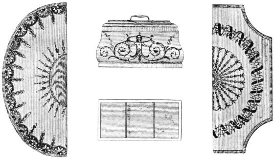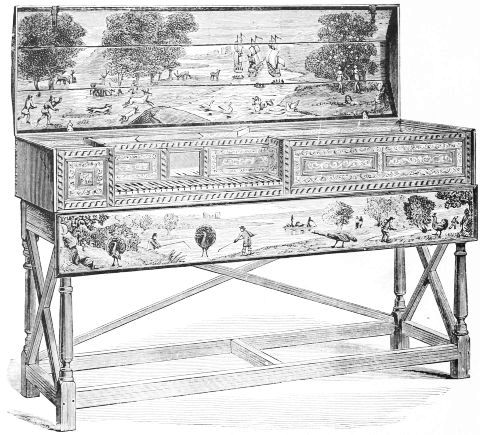 There is an illustration on p. 172 of a Harpsichord which is in the South Kensington Museum, and in the same collection are others, varying in types as instruments, and of different decorations. The one which belonged to Handel is a good specimen of the decoration bestowed on these instruments. Others of about the middle of the eighteenth century, were covered with a coating of lacquer, like some of the furniture referred to in Chapter VI., the parts of the cases to be so decorated having been sent to China, and returned when coated with the preparation, then only known to the Chinese, but afterwards imitated in Europe. Some of these lacquered cases are very beautiful, and those which were elaborately painted in the Vernis Martin style, are finished with the care of cabinet pictures or miniatures. They have, as a rule, the fine subject painting, or landscape, inside the lid of the case, as in the illustration on p. 172, while the outside of the case is decorated with arabesques of gold on a dark colored ground. Such an Instrument was sold at the sale of Lord Lonsdale's furniture, a few years ago, for some three hundred pounds.