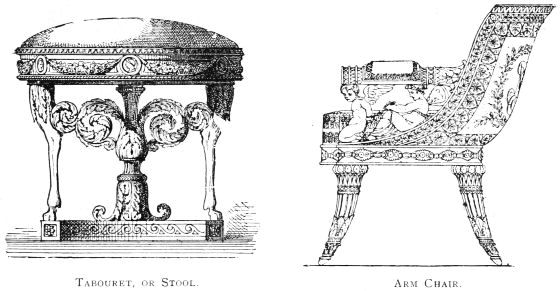 BIBLICAL REFERENCES: Solomon's House and Temple—Palace of Ahasuerus. ASSYRIAN FURNITURE: Nimrod's Palace—Mr. George Smith quoted. EGYPTIAN FURNITURE: Specimens in the British Museum—The Workman's Stool—Various Articles of Domestic Furniture—Dr. Birch quoted. GREEK FURNITURE: The Bas-reliefs in the British Museum—The Chest of Cypselus—Laws and Customs of the Greeks—House of Alcibiades—Plutarch quoted. ROMAN FURNITURE: Position of Rome—The Roman House—Cicero's Table—Thyine Wood—Customs of wealthy Romans—Downfall of the Empire 1