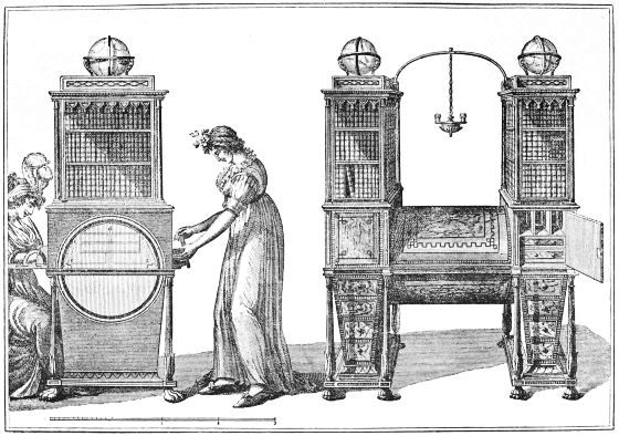 There are also instruments in existence, and designs, which shew that as the style of furniture changed during the time of the French Revolution, and subsequently to the Classic Greek, the Piano followed the new fashion. There is in St. James's Palace the instrument made by Broadwood for the Princess Charlotte, who died early in the nineteenth century. This is square in form, and is veneered with a single sheet of ivory, the elephant's tusk having been first softened by acid, and then cut circular fashion.