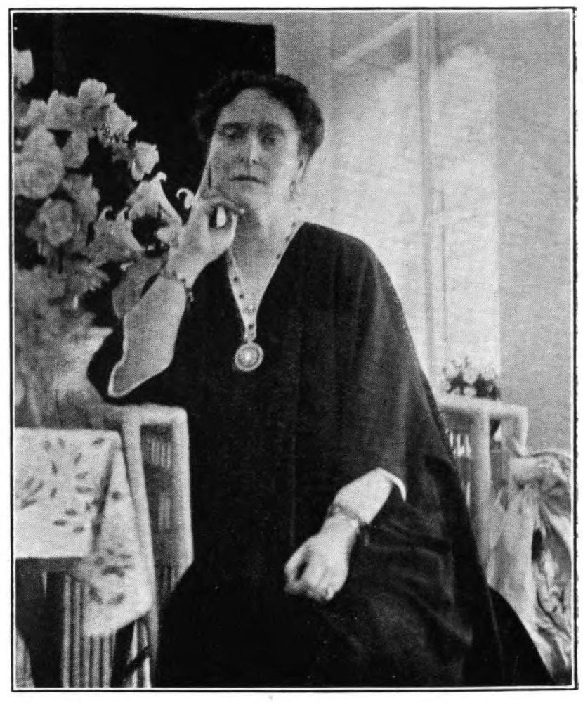 The Empress was dressed entirely in white, with a thin white veil draped round her hat. Her complexion was delicately fair, but when she was excited her cheeks were suffused with a faint rose flush. Her hair was reddish gold, her eyes—those infinitely tragic eyes—were dark blue, and her figure was as supple as a willow wand. I remember that her pearls were magnificent, and that diamond ear-rings flashed coloured fires whenever she moved her head. She wore a simple little ring bearing the emblem of the Swastika, her favourite symbol, and one which has given rise to so many conjectures, and been quoted triumphantly as proof positive of her leanings towards the occult by those who are ignorant of what it really meant to her.
