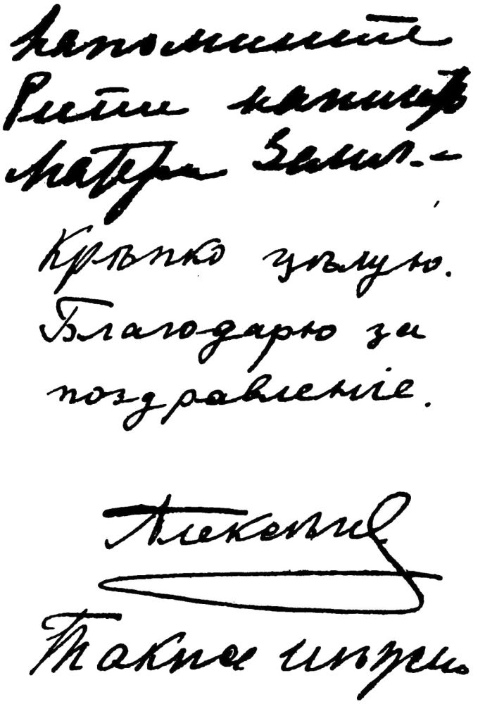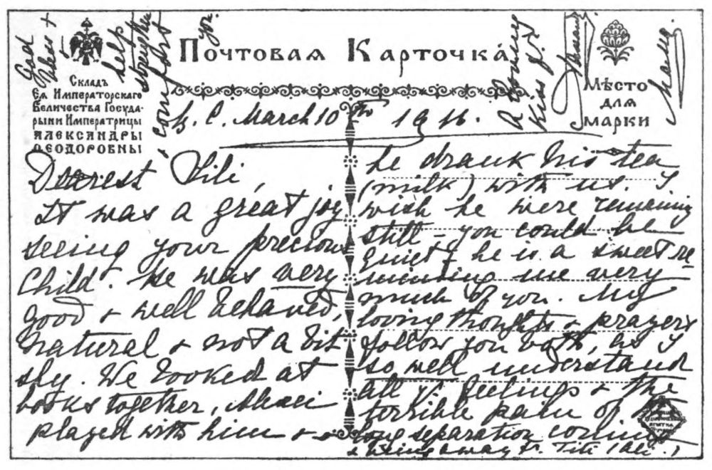 [13] The actual note to reproduced in these pages. Translation: “Kerensky is passing through all our rooms—Do not be afraid—God is present. I kiss you both.”