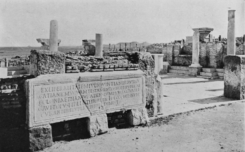 Among the buildings unearthed at Timgad there is one which, from its nature and the fact that it is unique, or almost unique, is especially interesting, and merits particular attention. The learned world has long been aware that the Public Library, which is a comparatively recent addition to most of our own towns, was a Roman institution. The allusions of Latin authors tell us so much; there were twenty-eight public libraries at Rome in the fourth century; and we gather from inscriptions that there is nothing original about Mr. Carnegie, except the extent of his munificence. The 267public libraries of provincial cities were often due to the liberality of wealthy citizens, and once established they were frequently enriched by the gifts and bequests of others. By a succession of fortunate accidents, which happily illustrate the romantic side of excavation, the Public Library of Timgad has been found and identified beyond question. This fact in itself gives a very special distinction to the ruins.