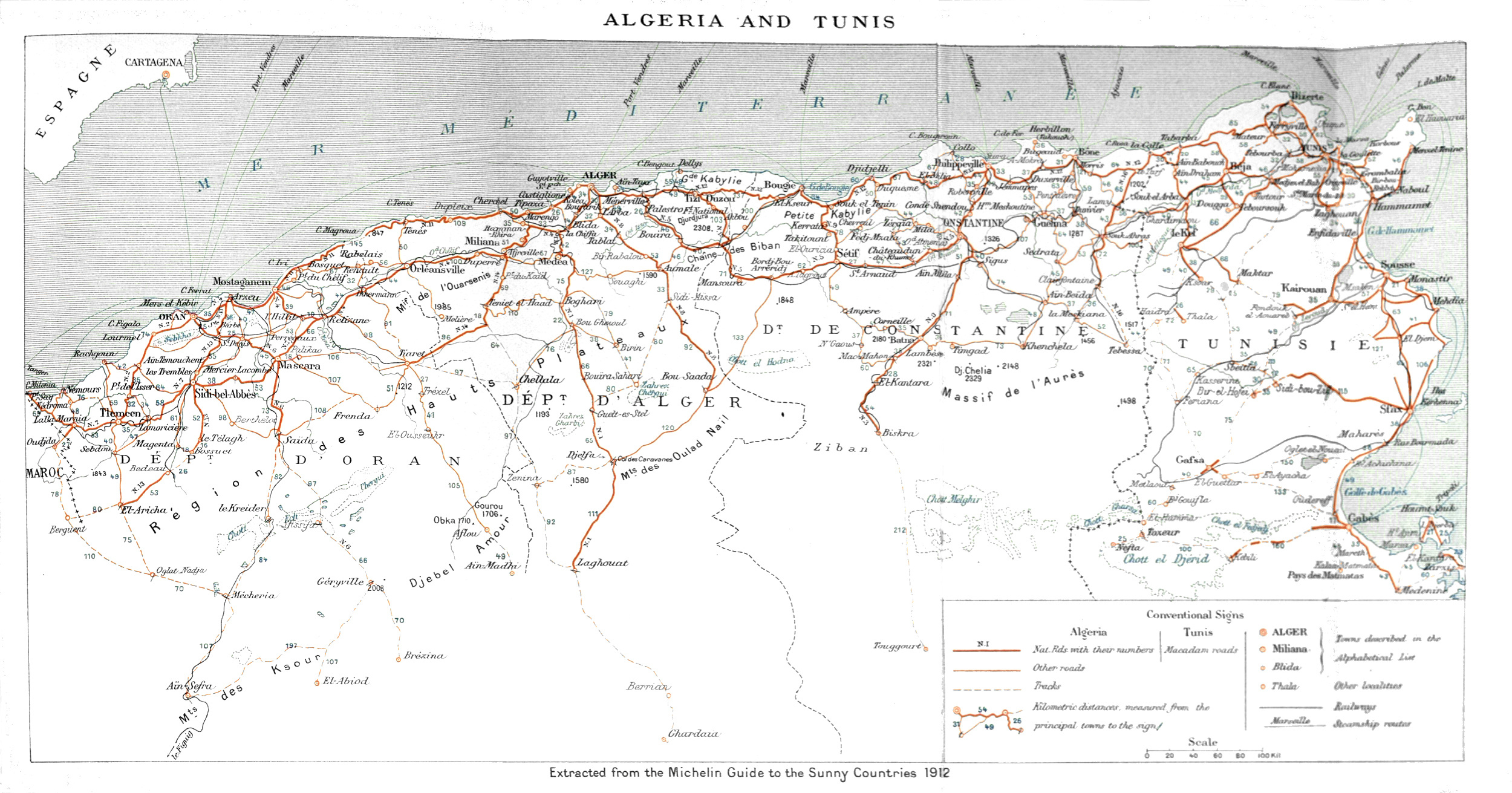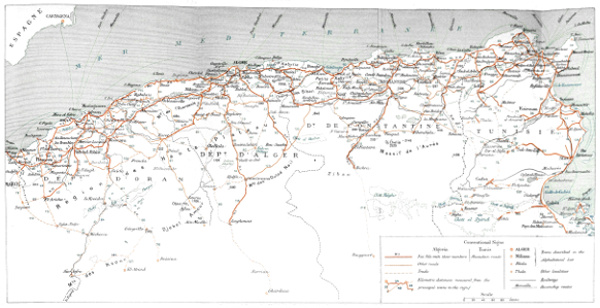 The guide-books to Algeria, in the English language at all events, are, in view of modern conditions of travel, hopelessly out of date. The motorist will, of course, provide himself with Messrs. Michelins’ admirable road-book. There he is furnished with precise and condensed 8information as to distances, surfaces, and hotels. The traveller who desires to look beyond these primary facts will find in M. Maurice Wahl’s “L’Algerie” (Cinquième Edition, Paris, 1908), a compendium of information—concise, logical, and complete, after the French manner; and he will regret that its usefulness is much diminished, in accordance with an unfortunate French fashion, by the absence of an index.