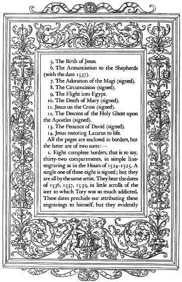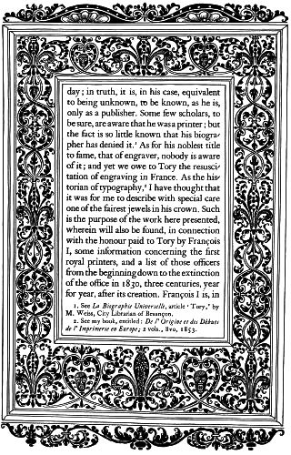 That so much has come to hand in so haphazard a way is but an additional proof of Tory's industry and versatility. There seems to be almost no limit to the work which may fairly be credited to him, and M. Bernard hardly exaggerated when he said that there was scarcely an illustrated volume of any importance issued in Paris during the first half of the XVI th century in which the artist of the Lorraine cross did not have a hand. Hours and Classics, Bibles and Testaments, Mathematical and Medical works—all bear evidence to his prolific pen and graver, and were time disregarded, the preparation of this volume might be almost indefinitely prolonged. Incomplete as it is, however, it is hoped that it will measurably fulfill the desire expressed by Mr. A. W. Pollard nearly fifteen years ago, in the first issue of 'Bibliographica.' Speaking of Bernard's monograph, he said, 'It would be pleasant if some French publisher would bring out a new edition worthily illustrated, for in 1865 the modern processes of reproduction were not yet invented, and the few and poor woodcuts in M. Bernard's book give no just idea of the artistic powers of Tory, whose illustrated editions are so difficult to meet with that M. Bernard's admirable commentary loses half its value for lack of a proper accompaniment of text.'
