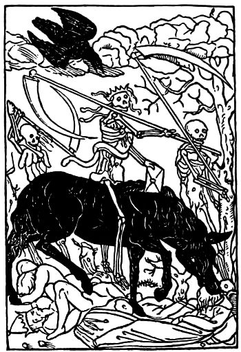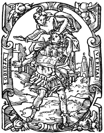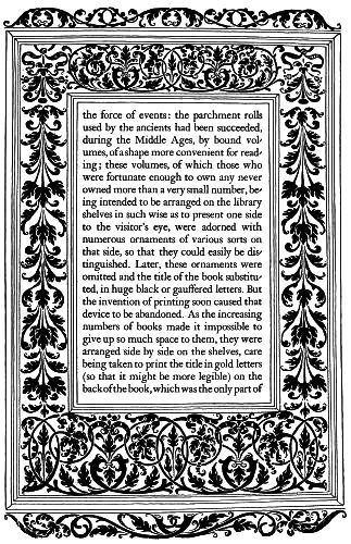 A word regarding the method of reproduction of these illustrations may not be out of place here. More was aimed at than mere photographic copies, which are in many ways inadequate. It was thought desirable to make the decorations an integral part of the typographic treatment of the volume and to preserve when practicable their original relations to the type. To attain this end, more perfect printing plates were necessary than could be obtained directly from the old editions. The designs, therefore, were all redrawn with the greatest care over photographs of the originals, and from these drawings photo-engravings made, which were afterward perfected by hand when the forms were on the press.