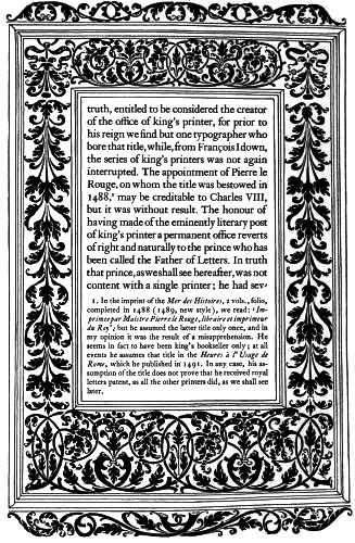 Since such authorities as M. Bernard and M. Renouvier differ as to the ascription to Tory of many of the designs mentioned in this work, it seemed the wiser course to choose for illustration only such subjects as are described by the author, without questioning the soundness of his reasoning or the infallibility of his deductions. The only exception is the beautiful design reproduced on the first page of the Index. This is taken from Robert Estienne's folio New Testament (in Greek) of 1550, where, with two other similar decorations, it occurs in conjunction with the friezes and floriated Greek letters reproduced elsewhere in this volume. They are unsigned, but all are indubitably from the same hand. Although they are not mentioned by M. Bernard, it seems incredible that he should never have seen them.