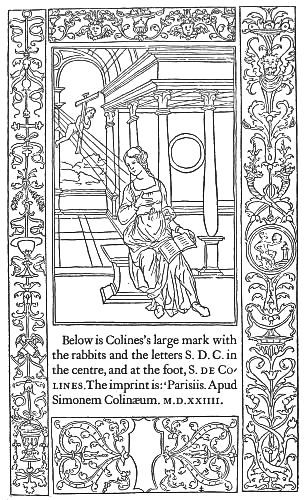 Notwithstanding some inevitable slight divergences of line, this method preserves with far greater faithfulness the spirit and effect of the original prints, and the result is more truly a facsimile than a direct photographic copy would have been. Both drawing and engraving of Tory's designs were exquisite, and as a rule they were beautifully printed, especially by Colines and Robert Estienne. Some of them, however, suffered at the hands of inferior printers. Imperfections and irregularities due to the carelessness or unskilfullness of the printer are readily discernible, and in the reproductions in this volume have been eliminated. The preservation, by this treatment, of more of the beauty and interest of the originals is sufficient justification for departing to this extent from the usual methods of facsimile reproduction.