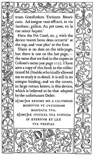 That so much has come to hand in so haphazard a way is but an additional proof of Tory's industry and versatility. There seems to be almost no limit to the work which may fairly be credited to him, and M. Bernard hardly exaggerated when he said that there was scarcely an illustrated volume of any importance issued in Paris during the first half of the XVI th century in which the artist of the Lorraine cross did not have a hand. Hours and Classics, Bibles and Testaments, Mathematical and Medical works—all bear evidence to his prolific pen and graver, and were time disregarded, the preparation of this volume might be almost indefinitely prolonged. Incomplete as it is, however, it is hoped that it will measurably fulfill the desire expressed by Mr. A. W. Pollard nearly fifteen years ago, in the first issue of 'Bibliographica.' Speaking of Bernard's monograph, he said, 'It would be pleasant if some French publisher would bring out a new edition worthily illustrated, for in 1865 the modern processes of reproduction were not yet invented, and the few and poor woodcuts in M. Bernard's book give no just idea of the artistic powers of Tory, whose illustrated editions are so difficult to meet with that M. Bernard's admirable commentary loses half its value for lack of a proper accompaniment of text.'