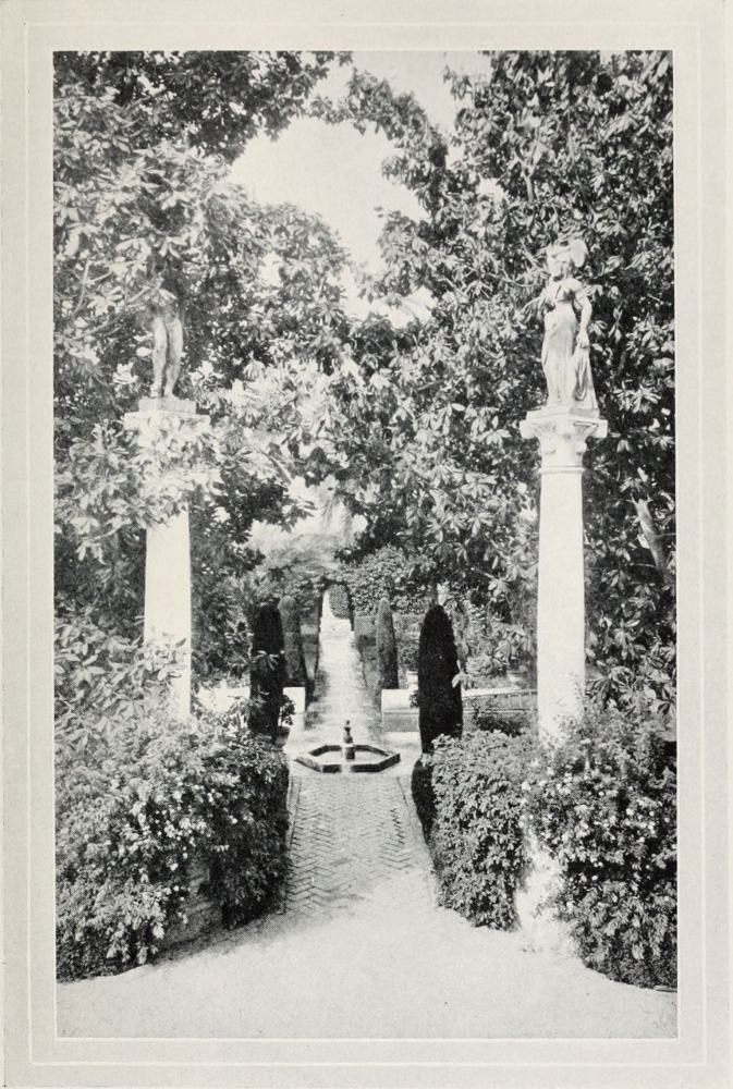 The Alcazar is a Moorish palace of great beauty, with walls and ceilings all covered with intricate patterns of carving and bright colours, so that it was{37} like coming to live in a palace of the Arabian Nights. The inner courtyards are Oriental, cooled by fountains. The garden around the palace is Oriental, in tiny squares and flower-beds, with short paths, and no place for one to run. And around the garden the high wall is Oriental, a true harem wall, over which one could not see. In all the rooms of the palace there is not one door; and when we had hangings put up in the Moorish arches of our bedroom doorways the servants were surprised. They did not understand the desire for privacy. Sentinels and guards were on duty everywhere; a man even walked all night under my bedroom windows; and whenever we went into the gardens the trumpets were sounded—Heaven only knows why!