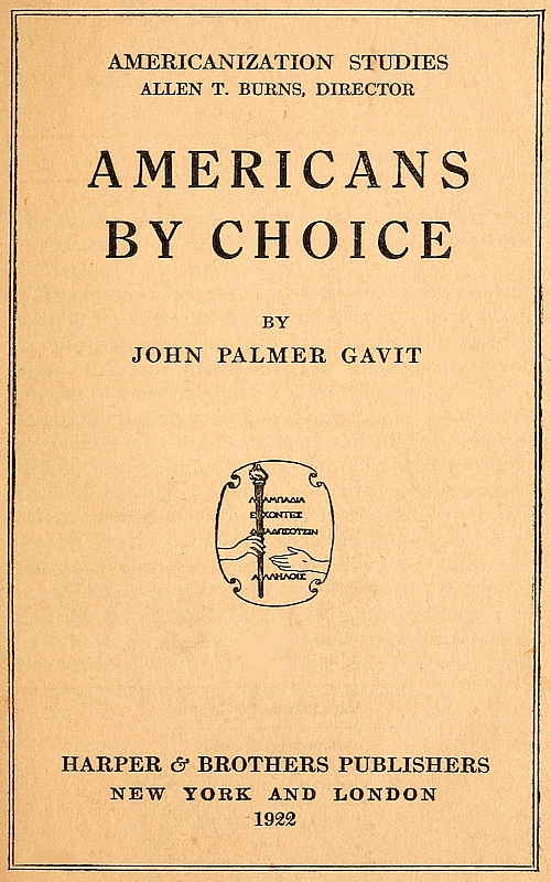 The Project Gutenberg EBook of Americans by Choice, by John Palmer Gavit This eBook is for the use of anyone anywhere in the United States and most other parts of the world at no cost and with almost no restrictions whatsoever. You may copy it, give it away or re-use it under the terms of the Project Gutenberg License included with this eBook or online at www.gutenberg.org. If you are not located in the United States, you'll have to check the laws of the country where you are located before using this ebook. Title: Americans by Choice Author: John Palmer Gavit Release Date: October 27, 2019 [EBook #60576] Language: English Character set encoding: UTF-8 *** START OF THIS PROJECT GUTENBERG EBOOK AMERICANS BY CHOICE *** Produced by ellinora, John Campbell and the Online Distributed Proofreading Team at http://www.pgdp.net (This file was produced from images generously made available by The Internet Archive/American Libraries.)
