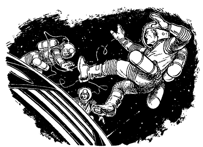 Morgan began examining the interior of the tiny cabin. Slowly he turned his head, looking at one piece of equipment after another, visualizing what was packed away under it and behind it. To the right of the radio was the spacesuit locker, and his glance lingered there. He reached over, opened the door and slipped a hand under the suits packed in the locker. For a moment he fumbled and then he sat back holding an oxygen flask in his hand. He hefted the small steel flask and looked at Kaufman. "Can you think of anything better than this for throwing?"