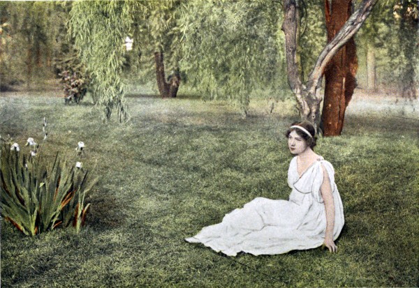 The banks of the stream fell suddenly away on either side and the canoe glided slowly and softly into a miniature lake. It was perhaps twenty yards across at its widest place and much more than that in length. Occasionally a far-reaching branch threw trembling shadows on the water, but for the most part the trees stood back from the margin of the pool and allowed the fresh green turf to descend unhampered to the water’s edge. At a point farthest from where Ethan had entered a little cascade tumbled. On all sides the ground[18] sloped slightly upward, and in one place a group of larches crowned the summit of a knoll and mingled their delicate branches far above the neighboring maples. Almost concealed among them an uncertain gleam of white caught at moments through the trees to the right suggested a building of some sort—perhaps the marble temple of the divinity, who, seated on the bank with her bare sandaled feet crossed before her, observed the intruder with calm, dreamy, almost smiling unconcern.