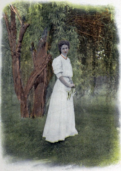 But it was not Clytie he saw; not unless the fashions have changed considerably and water-nymphs may wear with perfect propriety white shirtwaist suits and tan shoes. It was not impossible, he reasoned; for all he knew to the contrary, the July number of the Goddesses’ Home Journal—doubtless edited by Minerva—might prescribe just such garments for informal morning wear. At all events, being less bizarre than the flowing peplum of yesterday, Ethan—whose tastes in attire were quite orthodox—liked it far better. The effect was quite different, too. Yesterday she might have been Clytie; to-day reason cried out against any such possibility;[34] she was a very modern-appearing and extremely charming young lady of, apparently, twenty or twenty-one years of age, with a face, at present seen in profile, piquant rather than beautiful. The nose was small and delicate, the mouth, under a short lip, had the least bit of a pout and the chin was softly round and sensitive. This morning she wore her hair in a pompadour, while at the back the thick braids started low on her neck and coiled around and around in a perfectly delightful and absolutely puzzling fashion. Ethan liked her hair immensely. It was light brown, with coppery tones where the sunlight became entangled. She was seated on the sloping bank, her hands clasped about her knees and her gaze turned dreamily toward the cascade which sparkled and tinkled at the upper curve of the pool. As the[35] canoe had made almost no sound in its approach, she was, of course, ignorant of Ethan’s presence. And yet it may be mentioned as an interesting if unimportant fact that as he gazed at her for the space of half a minute a rosy tinge, all unobserved of him, crept into her cheeks. He laid his paddle softly across the canoe, and,——