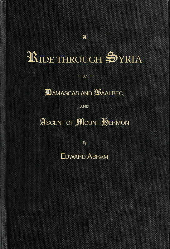 The Project Gutenberg EBook of A Ride through Syria to Damascus and Baalbec, and ascent of Mount Hermon, by Edward Abram This eBook is for the use of anyone anywhere at no cost and with almost no restrictions whatsoever. You may copy it, give it away or re-use it under the terms of the Project Gutenberg License included with this eBook or online at www.gutenberg.org/license Title: A Ride through Syria to Damascus and Baalbec, and ascent of Mount Hermon Author: Edward Abram Release Date: November 2, 2019 [EBook #60615] Language: English Character set encoding: UTF-8 *** START OF THIS PROJECT GUTENBERG EBOOK A RIDE THROUGH SYRIA *** Produced by MFR, Barry Abrahamsen, and the Online Distributed Proofreading Team at http://www.pgdp.net (This file was produced from images generously made available by The Internet Archive)