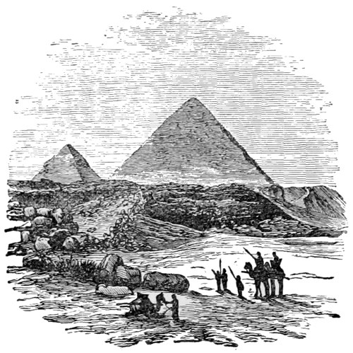 We halt for lunch at El Tireth (from the name, probably once a fortified town), and, after a ride of eleven hours, halt for the night at a Mahommedan village called Baka, which probably now for the first time receives a European guest (as even my guides had not been there before): the sun being already set, it is the only refuge near us. It is built of mud on the slope of a hill near an old ruined fountain enclosed in massive masonry. Most of the wells and fountains we see on the way had been similarly well cared for in ancient times, but are now fast falling into decay. We will give you a little idea of an Eastern village:—Place a honeycomb with the cells perpendicular, cover the top of some of the cubes to represent a flat mud roof, leave others open to represent small stable yards for all the domestic animals in creation, camels included, and you have an Arab village of one-storeyed huts, scarcely distinguishable at a distance from the hillside on which it is plastered. The Sheiks’ houses have an additional storey, a guest-chamber built on the wall. One of these we occupy, not a pane of glass in the place and quite innocent of any furniture whatever, which is perhaps an advantage, considering the creeping things innumerable which abound in Eastern villages. Our guard and other retainers sleep in the open yard with the horses, and leave their weapons with us for safe custody, so for the time I am the custos custodum, but our quarters are inviolable, as for the nonce we are the guests of the village. A few crossed sticks in the corner of the yard form the nearest approach to a fire-place.