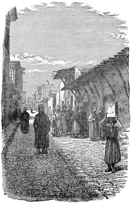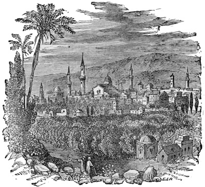 We see the Wali, or Governor, Hallett Pasha, sitting alone on a chair by the river side enjoying otium sine dignitate; his guards at a distance standing by their horses ready to look after him, if necessary. He politely returns our passing salute in true Parisian style. Like all other Turkish Pashas he will have to make hay while the sun shines and be sharp about it. His predecessor, Midhat Pasha (of mournful memory) did not enjoy the sunshine long, and Hallett’s may be a similarly short summer. It costs money to be a Damascus Pasha, some £4000 has to be first found for the Palace Cabal at Stamboul. The official pay of the appointment is under £3000 a year, so the moment a Pasha gets to his government he has to set to squeezing; he squeezes backsheesh out of the higher officials, and they squeeze the lower and the public, who are fair game for all. Justice, not at all blind here, is continually looking out for the dollars. But to return to Damascus. The plain in which it is situated is surrounded on three sides by mountains, Lebanon, Anti-Lebanon and Hermon; on the east it is bounded by the Syrian desert, in the midst of which is the city of palm trees, Palmyra, the ancient Tadmor, the city of Zenobia, the Boadicea of the Syrians. Well might the Moslem, arrived in this ever-verdant plain, after six days dreary riding across the desert, when he came across this city embosomed in beautiful gardens and 29orchards, when he saw the rills of living water flowing in all directions and rising in fountains in the very court-yards of the houses, well might he imagine that he had lighted at last upon the Garden of Eden. We find comfortable quarters at Demetri’s, the only Frank hotel, and are glad again to see some signs of western civilisation.