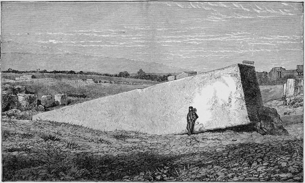 The Bukâa, supposed to be the Bikath Aven of the Hebrews (Amos i, 5), is a long plain extending about one 50hundred miles between the Lebanon and the Anti-Lebanon mountains, leading down to the Jordan valley, and the Mediterranean. It was anciently called Cœlesyria or Hollow Syria, and was the natural highway of the invading armies of Egypt, Persia, Assyria, &c., from all time. It is mentioned in the Bible as the “entering in of Hamath,” but was only for a short time in the possession of the Kings of Israel. Along this plain commander Cameron projected a railway between Damascus, viâ Baalbec, Homs, Hamah and Aleppo northwards, with a branch from Homs to Tripoli westwards, and to Jerusalem along the western side of the Jordan valley—all possible enough to make, but scarcely probable to pay. The railway was to be commenced at Tripoli, taking a détour to Damascus to avoid the mountains. This enterprising project was to embrace, eventually, a Euphrates valley line to Bombay, viâ the Persian Gulf, and to Northern India, viâ Persia and Afghanistan, and the system was to be connected with Constantinople by a line through Asia Minor, viâ Diarbekir to Ismid, where it would join the railway to Scutari and the Bosphorus, opposite Stamboul. It is a pretty project on paper, a magnificent prophecy of the future, and we hope that commander Cameron will live to see his great scheme a paying reality. Soon after leaving Baalbec we come across an isolated ruin, the shrine of some Moslem saint reared evidently out of the ruins of the Acropolis.