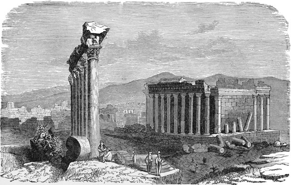 Baalbec, more correctly, we believe, Baalbak, is situated about forty-five miles north of Damascus but slightly to the west, on the lowest slope of Anti-Lebanon, near the source of the Leontes or Litany. The Litany and Orontes rivers rise six miles west from Baalbec within one mile of each other. The Litany runs west down the Bukâa or Cœlesyria, and falls into the sea between Sidon and Beyrût. The Orontes, El Asi or rebellious river, so called because it changes its course in a remarkable manner, flows north and falls into the Gulf of Antioch. Baalbec is the point where the great roads from Damascus, Tyre, Beyrût and Tripoli converge, hence probably its great ancient importance, and it was also the entrance gate to Padan Aram or Upper Syria where Terah lived, whence Abram emigrated and whither Jacob went to seek a wife among the daughters of his uncle Laban, who was also his cousin and subsequently his father-in-law, a very mixed up series of relationships; even more puzzling than that which befell the proverbial American who married his stepmother’s mother, and was driven to despair, insanity and death, because he never could make out what relation he was to himself.