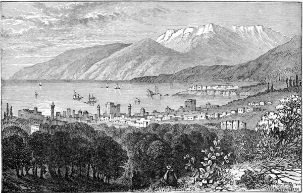 We now bid adieu to Beyrût, with its cedar clad hills, its orange, lemon and banana groves, its curious bazaars, its bustling lanes and its busy quays, and embark on board an Austrian steamer for Port Said, where we find the Peninsula and Oriental Southampton steamer, Venetia, which lands us at Malta, off which interesting island we see a remarkable sight—five waterspouts in a row in full swing; they are very fortunately a long distance off. After a day’s rest there we cross over to Sicily, to Syracuse, still infamous for deeds of blood, as of old, and celebrated for its ruined theatre, where Æschylus, before 20,000 sympathetic listeners, was wont to recite his immortal tragedies. Here also is the rock-hewn “Ear of Dionysius,” where a penny popgun goes off with the report of a pistol. It was visited by St. Paul on his way from Malta to Rome. Arriving before dawn, we are glad to get a little loaf of bread for breakfast, and find it well worthy of the lovely island of Ceres, moist and wholesome, so that we can comfortably swallow it without the coffee we cannot get. We next come to Catania, famous for its sulphur and nitre mines, the starting point for the ascent of Etna; and then pass the Scagli-de-Cyclopi—the rocks flung fruitlessly at Ulysses by the once one-eyed, but then blind cannibal giant 54Polyphemus, who, however, took better aim at the unlucky lover of Galatea, whose blood still poetically flows in the little river in memory of him, the Acis which we soon after pass, and then we come to that beautiful Sicilian Ehrenbreitstein Taormina.