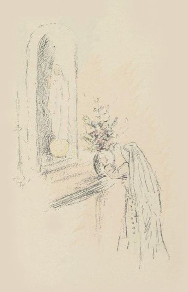 28 Mai.—Le miracle est à Tilly-sur-Seules. Une gardeuse de vaches a audience de la Vierge. Le rendez-vous est dans un champ, près d’une haie 25 qui se vêt d’une vapeur mystérieuse. La voyante n’est point quelque nonne diaphane qui, d’avoir fleuri la mère immaculée, dans son rêve enfantera la virginale image; c’est une fille épaisse et vulgaire, libre en ses propos d’étables. Elle vaque aux soins des bestiaux, remue son fumier, et sa fourche au repos, vient au champ. Elle s’y agenouille, et l’expression commune de sa face s’éclaire, s’idéalise. Dans l’extase qui la transfigure, ses yeux s’emplissent du divin. Elle commence, entre ses dents qui se choquent, des mots entrecoupés dans lesquels on croit comprendre que la Vierge est là. La vierge s’en retourne, et les prunelles de la voyante suivent, angoissées, sa fuite dans le ciel.