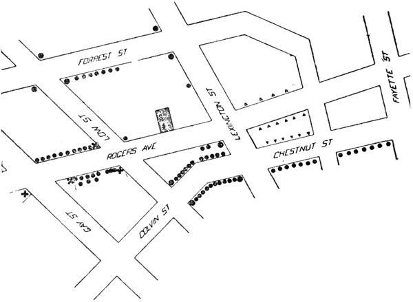 A map of the lower Druid Hill Avenue District. In this district there were forty-two saloons, fifteen churches, twelve schools, one home for old people, one home for friendless children, the colored Y. M. C. A. and the colored Y. W. C. A.