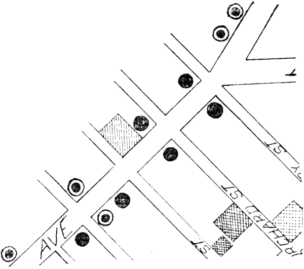 This district is infested with dives and disorderly houses. The small dots indicate the disorderly houses; the large dots liquor saloons; the crosses around them are liquor saloons which have disorderly houses connected with them; the small triangles are houses that are suspected.