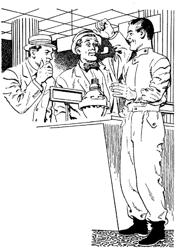 As the two of them headed for the door to the basement, Ken said to Jack in a low tone: "There goes another customer out ahead of us. I'm going to stop him outside and see if he can give us the answers to some of the things I don't understand about this place."