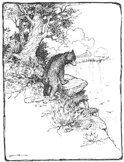 In mingled fear and rage the young bear ran on as fast as he could, not stopping until he arrived at the little brook at the bottom of the canyon. Here he took a long drink, and while it cooled his temper somewhat, the cold water fairly splashed in his empty stomach.