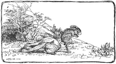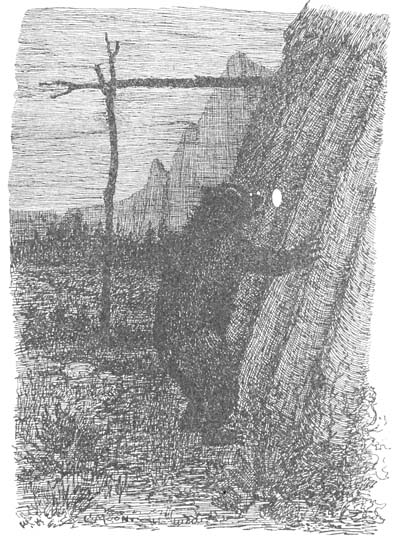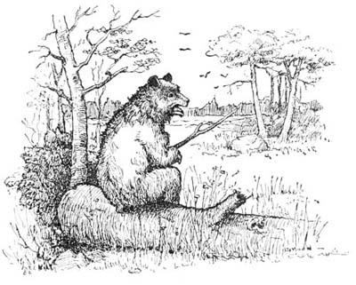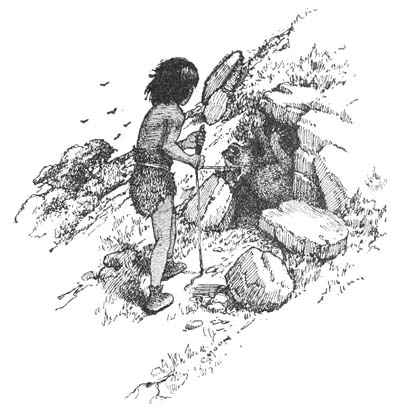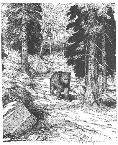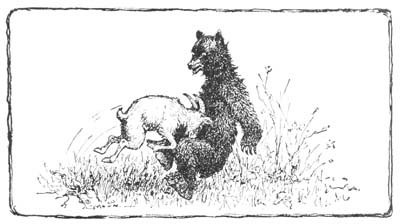 Suddenly there was a rush from behind, followed by a stinging blow on the head that sent[17] him tumbling over and over down the hillside. Scrambling to his feet he made off at top speed, catching a glimpse of the great black bear from over his shoulder as he ran.