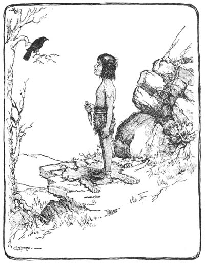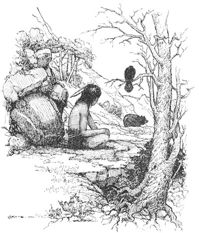 “One of the arrows from the Sun God must have struck me! I am bleeding to death! Oh, what shall I do? Oh, what shall I do?” He began to sink even more rapidly toward the ground. Sure enough, a great, red stain was growing on his back and crimson drops were falling fast. When they reached the earth he lay still with closed eyes while Cho-gay and Kaw bent over him.